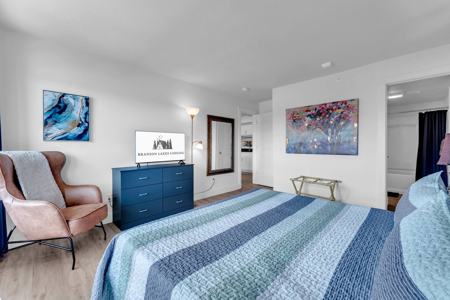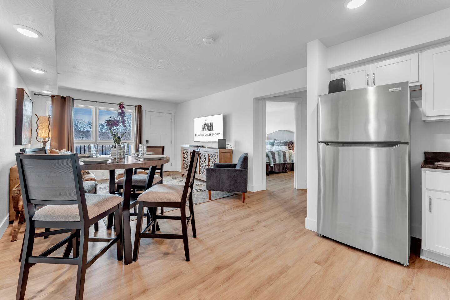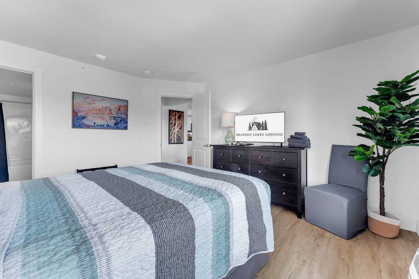 Outdoor Pool open through 10/1 Welcome to our charming and spacious two-bedroom, 2 bathroom Roark condo, your perfect getaway in Branson! This delightful retreat features a luxurious king-size bed in one room with a wonderful queen sized bed in the other. Both bedrooms feature attached bathrooms with a convenient shower and tub combo in one and walk in shower in the primary. Situated on the third floor of the all new Roark condos located on the roundabout in Branson you'll enjoy the convenience of easy access to the refreshing outdoor pool. Relax under the gazebo or watch the kids have fun in the dedicated climbing structure play area. This condo requires two flights of stairs. While an elevator is available on site, its operation cannot be guaranteed during your stay. You and your family can enjoy full access to the complete gym and indoor pool throughout your stay. The brand-new outdoor pool, gazebo, and children's play area are ready for you to enjoy. Staying in our condo near downtown Branson and The Landing offers an unbeatable combination of comfort, convenience, and excitement. Located in the heart of Branson, you'll be very close to an array of attractions, dining options, and entertainment venues. Branson Landing is a vibrant waterfront district featuring a delightful mix of shops, restaurants, and live entertainment. Stroll along the scenic boardwalk, catch a mesmerizing water and fire show at the fountain, or indulge in some retail therapy at the unique boutiques and major retailers. For family fun, visit the nearby Branson Scenic Railway, where you can take a picturesque train ride through the beautiful Ozark Mountains. Adventure seekers will love the proximity to thrilling attractions like the Branson Ferris Wheel, zipline tours, and the famous Silver Dollar City theme park. In the evening, enjoy a variety of live shows and performances, ranging from country music and Broadway-style productions to comedy acts and magic shows. With so many options just a short walk or drive away, you'll never run out of things to do. Staying in a condo near Branson Landing means you'll have all the excitement of Branson at your fingertips, while also enjoying a comfortable and convenient home base to relax in after a day of adventure. Book your stay now and immerse yourself in the best that Branson has to offer!